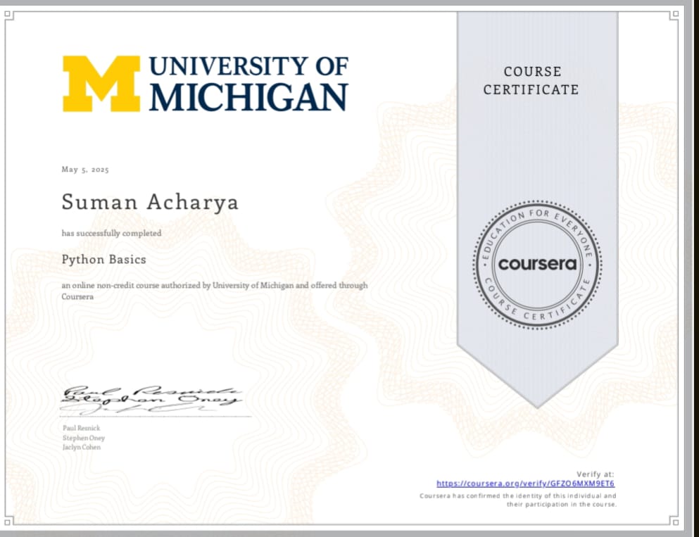 Hi, I’m Suman Acharya, Python Developer with a Bachelor's degree in Computer Application specializing in Computers. Proficient in SQL Server, Pandas, and Python for developing efficient and scalable solutions. Eager to contribute to dynamic projects and advance career in tech industry.